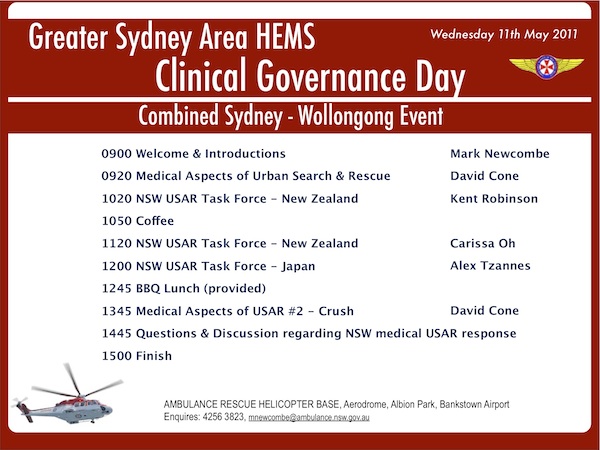 We are privileged to have a guest speaker from the United States, Dr David Cone. Dr Cone’s extensive CV includes being Associate Professor of Emergency Medicine and Public Health and EMS Section Chief at Yale University, the editor-in-chief of the journal Academic Emergency Medicine, and being a recent president of the National Association of EMS Physicians. He has served as Medical Team Manager of two urban search and rescue task forces (Pennsylvania and Connecticut). He is also a trained Emergency Medical Technician and firefighter!