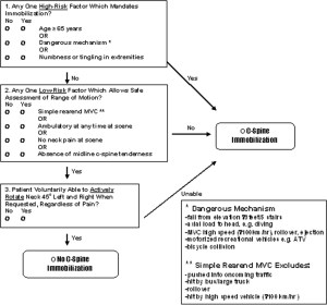 Enough ranting.  Lets get back to the real world.  I’m being realistic and accepting that collars are here to stay.  So can paramedics decide whether or not someone needs one?  Well it would appear so.  The NEXUS low-risk-criteria and the CCR are already well established in emergency medicine practice and have been shown to be safe and effective. In fact it has already been discussed  right here. Both rules have been prospectively validated by paramedics, with the CCR appearing more sensitive than NEXUS (100% sensitive in one study, with a follow up study under way).  As long as a decision support tool is well taught and there is effective clinical governance, there should be little risk involved.  The results of the study currently underway should be telling.  If the sensitivity approaches the 100% of the pilot, then there can be no excuse for EMS systems not to allow paramedics to use a clinical decision tool for spinal immobilization.