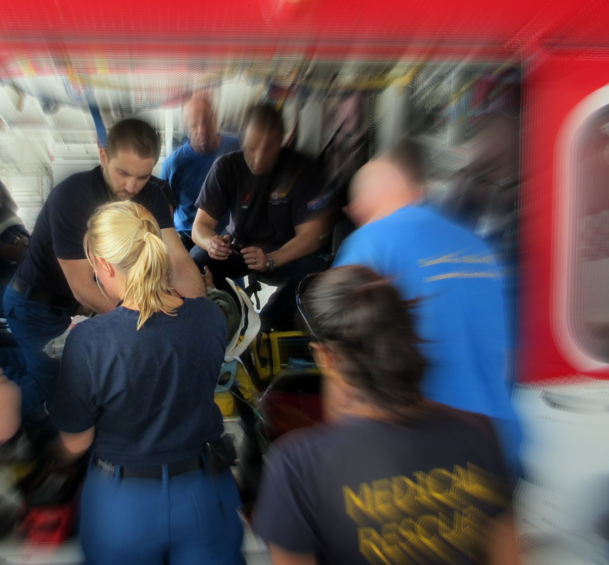 Challenges – Lighting, access and positioning all better at the aircraft than in a pitch dark stable. Complicating this were the unstable patient, the difficult terrain to traverse en route to the aircraft and the conflict between rapid extrication and more comprehensive assessment. The clinical challenges of identifying the obtunded patient requiring a secure airway, ventilation and a thoracostomy seemed less challenging to our super-slick team than the physical environment they encountered.
