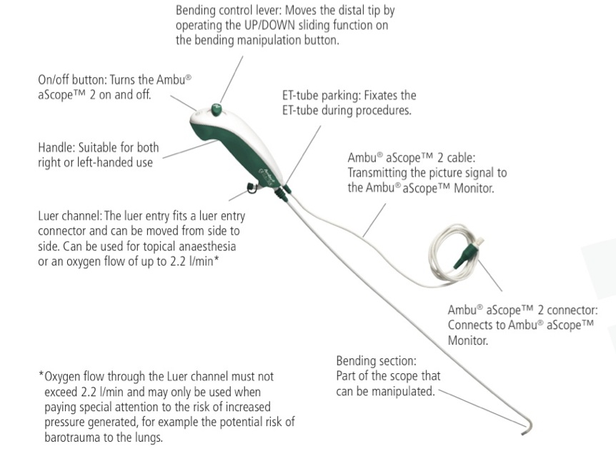 - In the rescue airway situation where an LMA has been placed and a scope can be use to improve accuracy of ETT placement. With a traditional scope the ETT could be preloaded and railroaded over the scope once it is through the cords. This is possible with the aScope but would require some gentle advancement of the scope and tube together before the scope came out the end of the LMA as the aScope is significantly shorter than a traditional scope. It has been suggested that the aScope could be passed into the cords with visual confirmation and then cut and used as a traditional bougie but this would then prevent visual confirmation of ETT placement into the trachea.