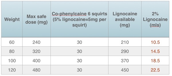 - Co-phenylcaine spray to the nose for both topicalisation and vasoconstriction. We started with 3 squirts/nostril as per the Advanced Airway protocol however needed to add approx. 3/nostril more. As co-phenylcaine is 5%, 1 squirt (0.1ml) is 5mg. It is very important to use the correct nozzle with the bottle as it then gives a correctly calibrated dose.The other advantage to co-phenylcaine is the vasoconstriction it produces. Despite a number of passes of the scope and scope + tube, there was no bleeding from Cliff’s nose.