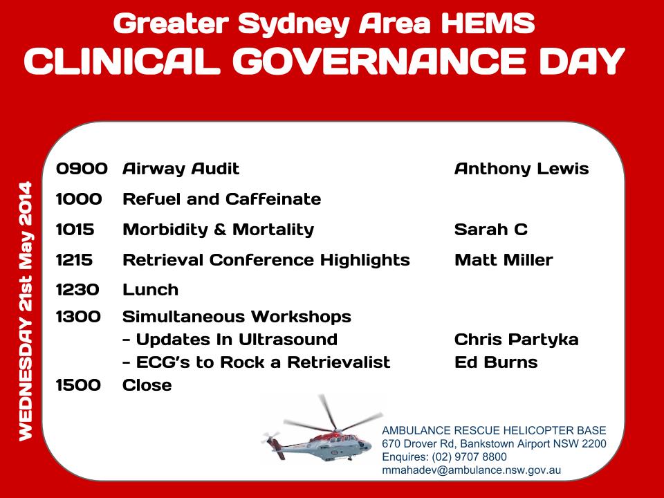- Updates in Ultrasound – A hands-on refresher session on eFAST, RUSH and basic echo with special guest Dr Chris Partyka (Ultrasound Registrar at Liverpool Hospital, EM blogger at The Blunt Dissection).