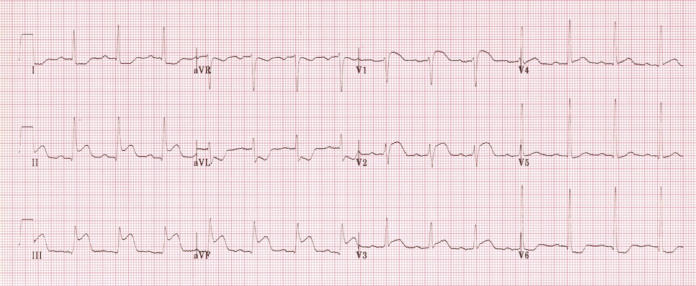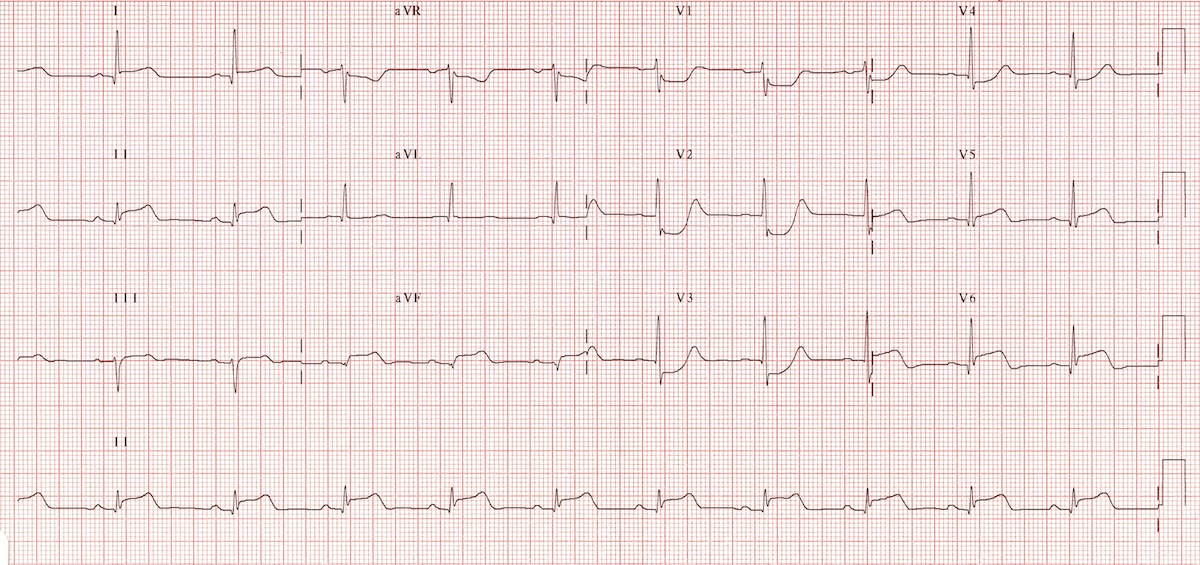 This ECG is a classic example of acute pericarditis. Positive findings include: