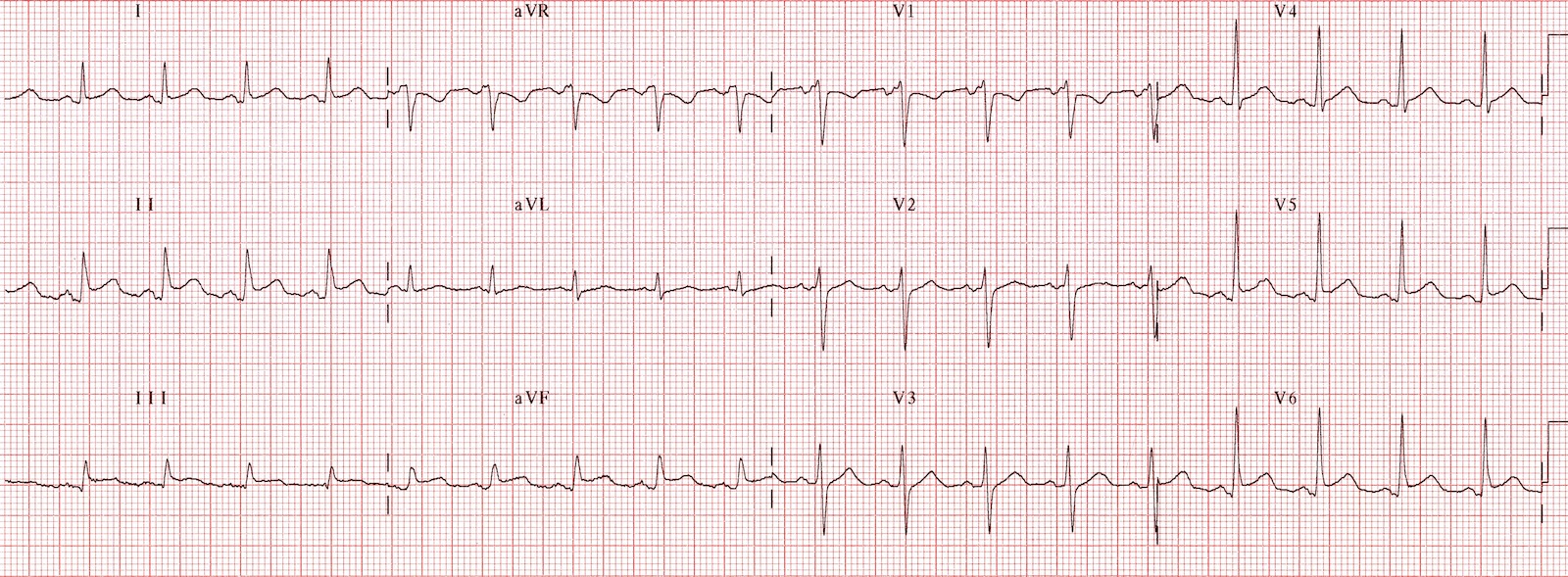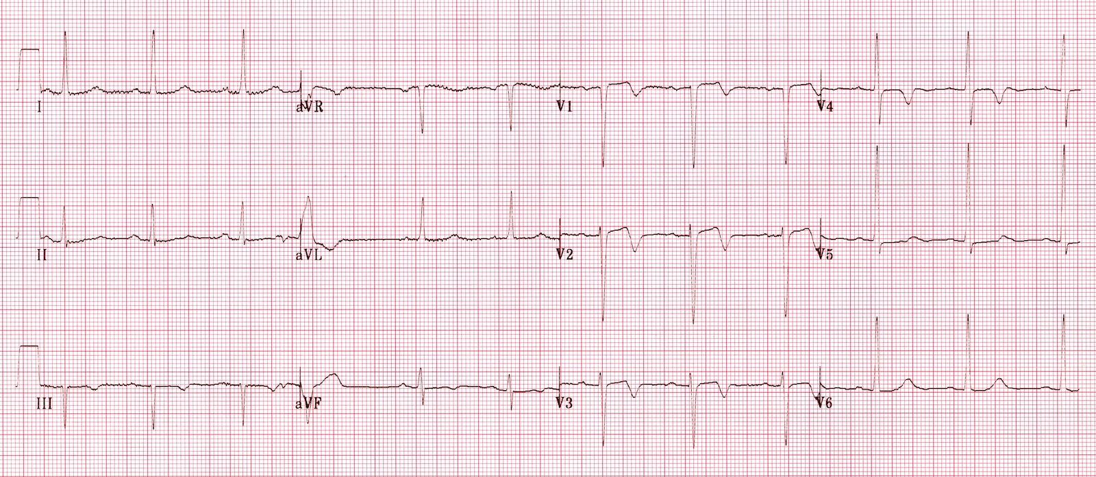 - Widespread horizontal ST depression, most prominent in the leftward-facing leads I, II and V4-6