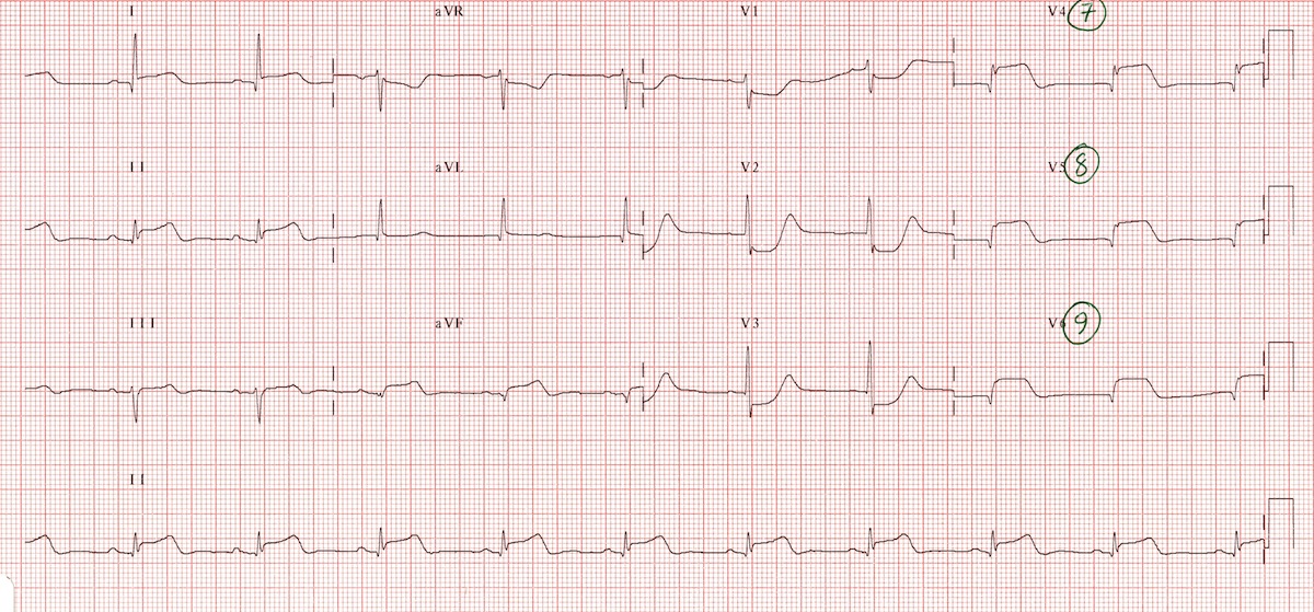 Repeat ECG with posterior leads (V7-9) confirms posterior wall infarction.