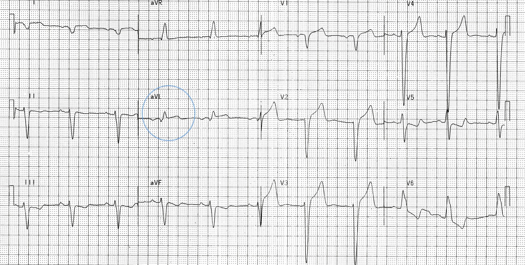 - Also note the ectopic atrial rhythm — P wave inversion in II, III + aVF.
