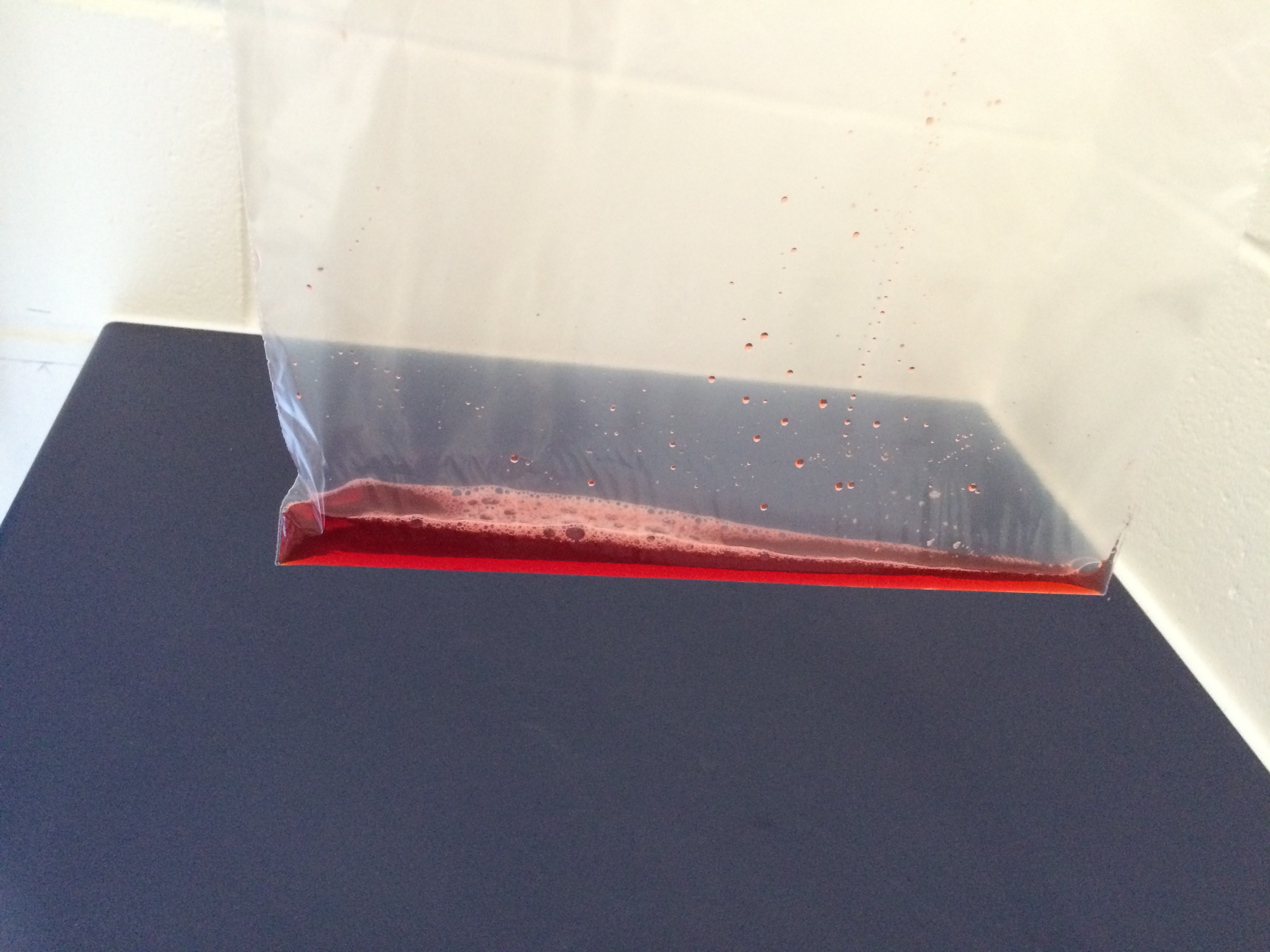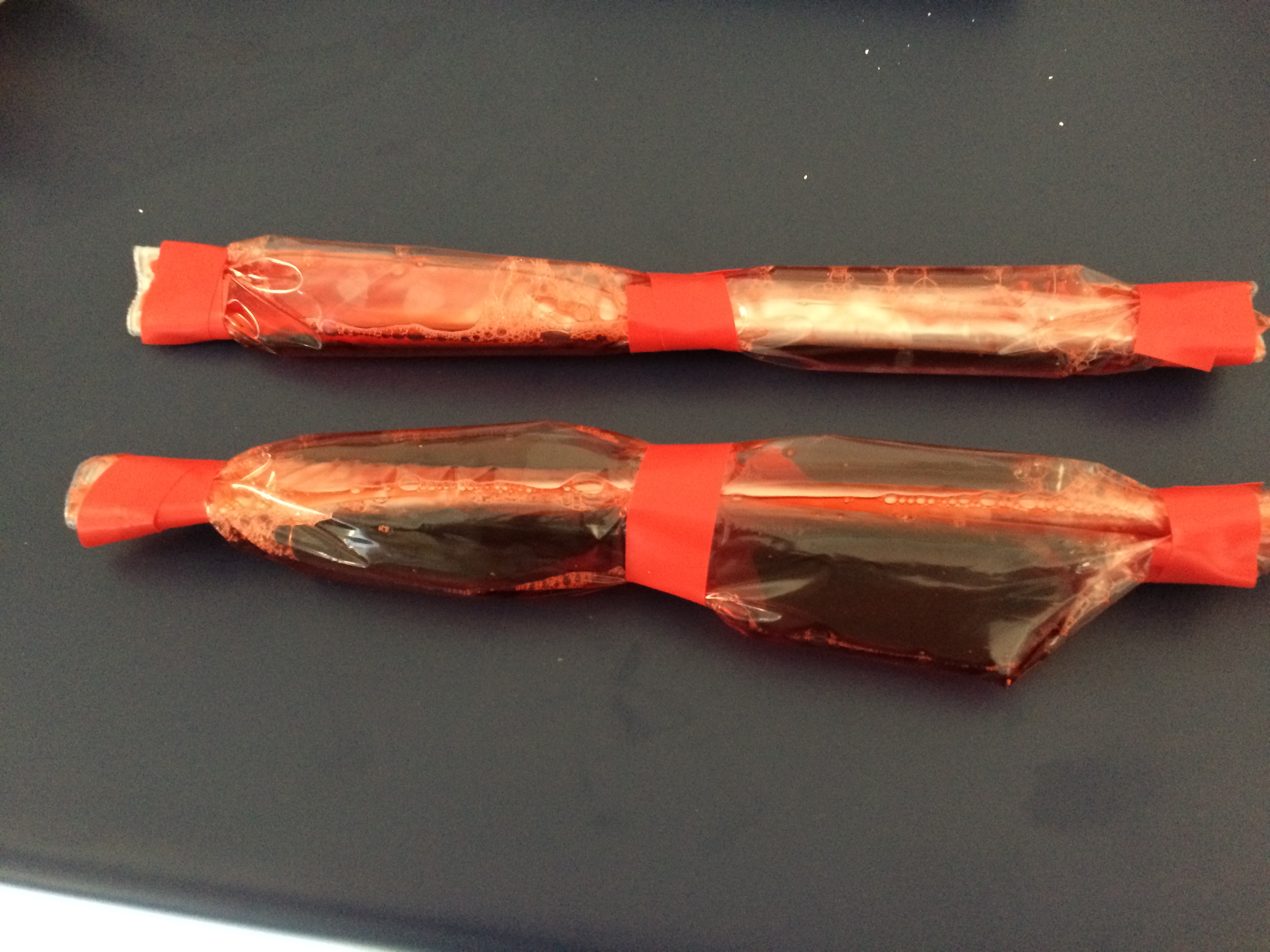 Keen to rise to the bleeding challenge, I used fake-blood purchased from a costume shop (in plentiful supply post-halloween) to fashion blood packets using sandwich bags.