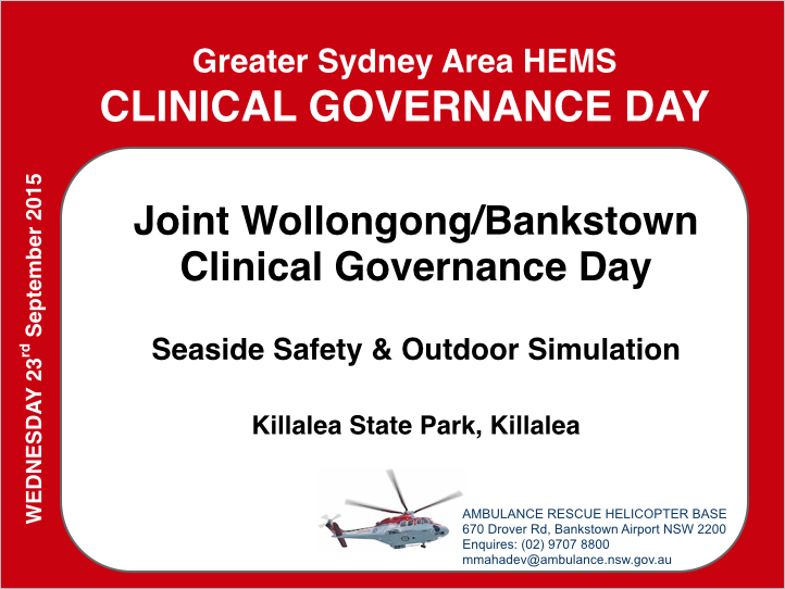 This weeks Clinical Governance Day sees the team from Bankstown trekking south to Killalea State Park to rendezvous with the Wollongong team for a joint-CDG focussing on seaside scene safety and the challenges of coastal rescue and resuscitation.