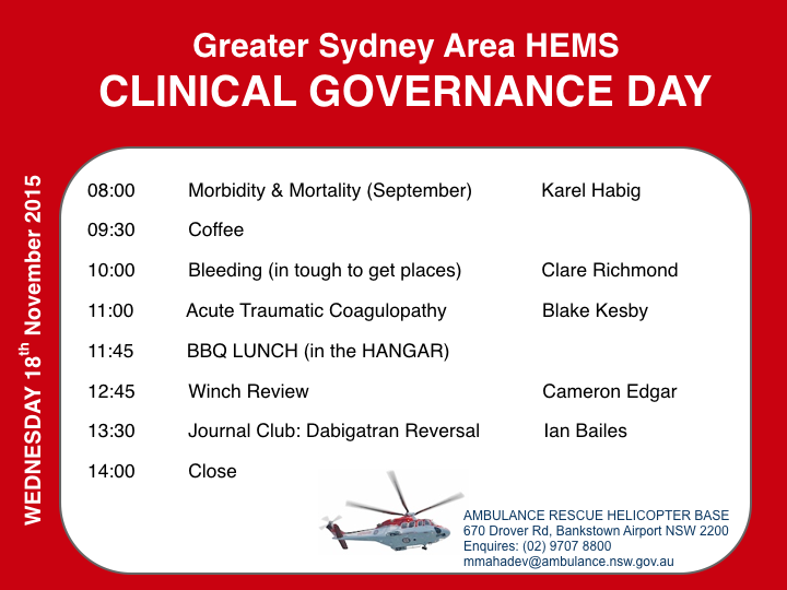 The next Sydney HEMS Clinical Governance Day is coming up next Wednesday, November 18th at Bankstown.
