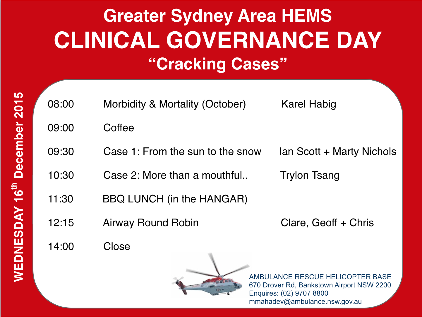 The Sydney HEMS Clinical Governance Day is returning after a month long hiatus and is scheduled for next Wednesday, December 16th at Bankstown.