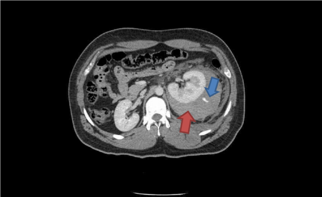 Trauma CT: Blue arrow is contrast ‘blush’=active bleeding point. Red arrow is perinephric haematoma.