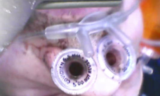 One team’s CMAC video showed a possible solution to this – placing one of the nasal cannula prongs within the lumen of one NPA, and the second alongside the nasopharyngeal airway (between NPA and nasal septum) – see sim photo below.