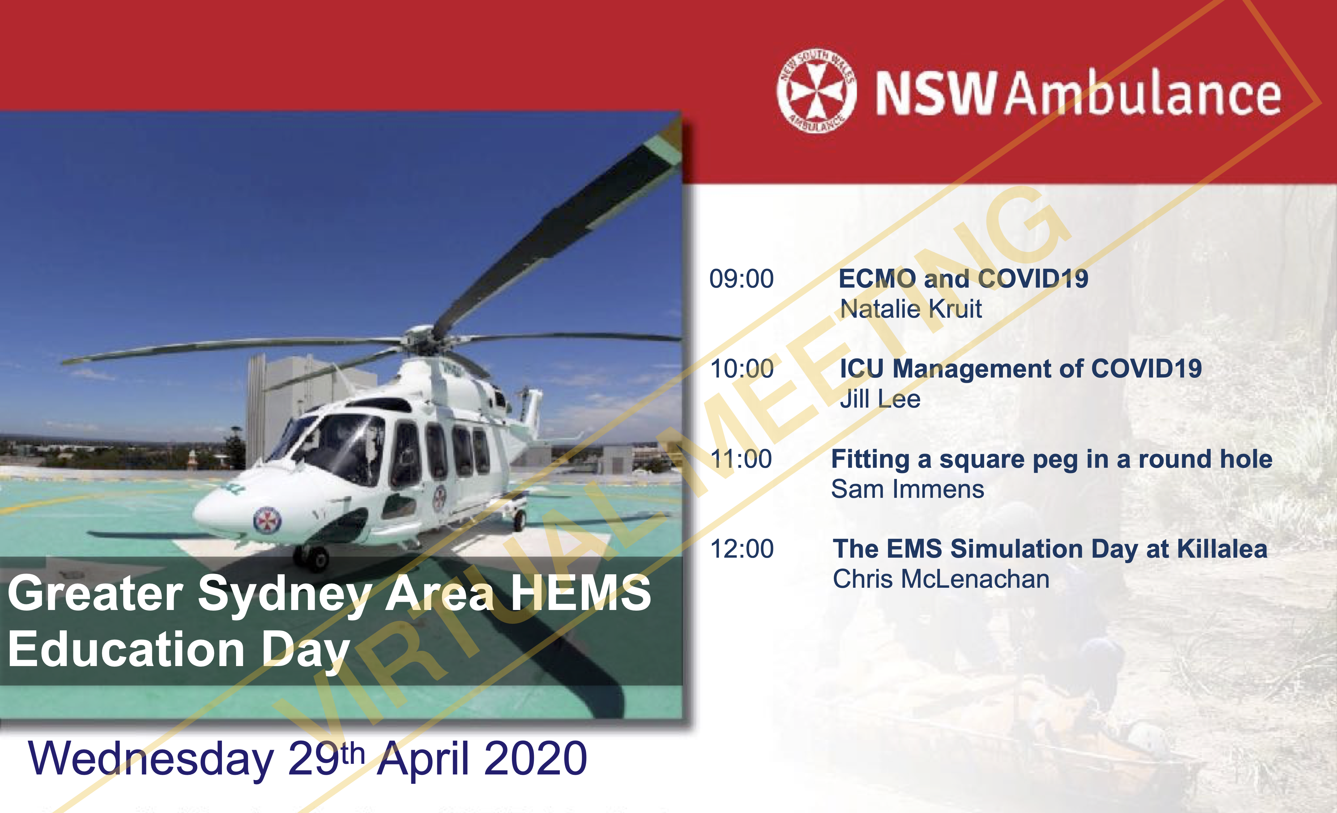 The education day started off with Dr Kruit speaking on ECMO in the COVID19 patient. Dr Natalie Kruit is a GSA HEMS Retrieval Specialist and a Cardiac Anaesthetist at Westmead Hospital, Sydney. To date there are around 360 COVID-19 patients worldwide being supported by ECMO, the predominance of which are on venous-venous circuits. Dr Kruit talked the group through ECMO experiences so far in COVID-19 and the challenges of its resource allocation during a global pandemic. The talk highlighted the current selection criteria being used in Australia to identify potential candidates for ECMO as well as the importance of optimising medical management as a pre-requisite to the therapy. It finished with the medical management of those patients who have been commenced on ECMO, focusing on issues experienced specifically with COVID-19 cases.