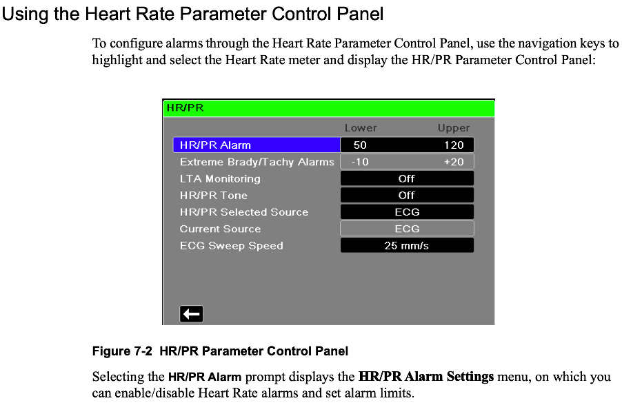 However, the monitor will use another available source for the HR/PR tone if the selected source is not available. For example, if only the pulse oximeter is attached to the patient, then that will be used as the source for the HR/PR tone. The pitch of the tone will change with the patient’s saturations, and is lower than if ECG is the source even with saturations of 100%.