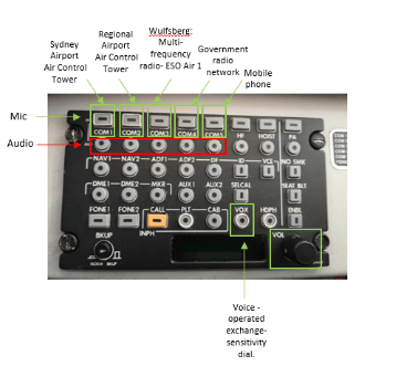 Air traffic control: Com1 and Com2 allow the aircraft to interact with the Sydney air traffic control tower and regional control towers when we’re landing elsewhere, including Bankstown. On this system, you often hear discussion between air traffic control and individual aircraft, planning approaches and runway management as well as aircraft identifying themselves to each other.