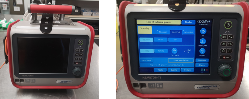 The Hamilton T1: A 7kg transport ventilator with a battery life up to 9 hours, this ventilator allows us to deliver between 2ml and 2000ml of tidal volume, making it suitable for all patients from neonates to adults and bariatric patients. There is the option to set PEEP between 0 to 35cmH2O and an inspiratory flow rate up to 260Lpm. The Hamilton T1 is also able to deliver intelligent NIV with reduced leak and a specific target Fi02. The Fi02 setting range is from 21% to 100% and there is also an integrated nebuliser and high flow options. The circuits are fully disposable, lightweight and easy to carry, and significantly for us- the ventilator can run independent of compressed air if needed.