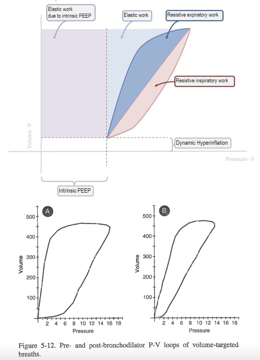 The Pressure-Volume Loop- again, the Hamilton can do this. Expiratory work of breathing is composed of elastic and resistive work of breathing. As bronchospasm worsens, the expiratory resistive work of breathing will increase.