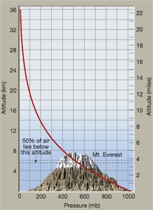 Atmospheric pressure decreases with altitude (Boyle’s Law) in a non-linear relationship (because air is compressible, unlike water under which pressure is linearly related to depth):
