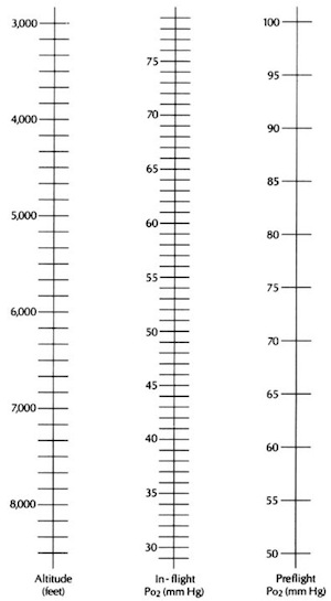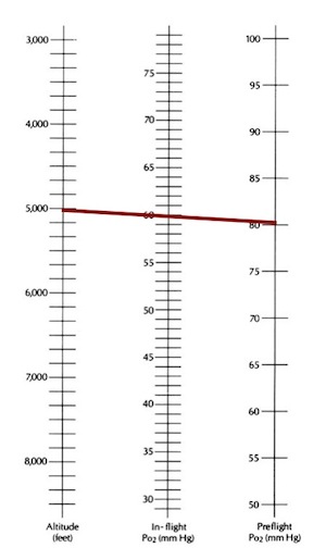 Eg. A patient with a pO2 on the ground of 80 mmHg will at an altitude of 5000 feet drop their pO2 to 60 mmHg: